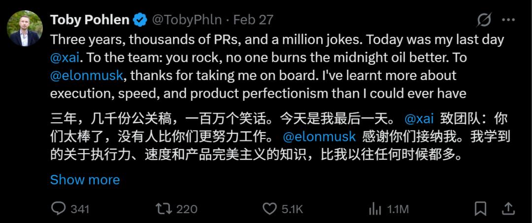 包括这一次xAI前创始成员Toby Pohlen(以下简称托比哥)的爆料,也盖戳证实了这一点: