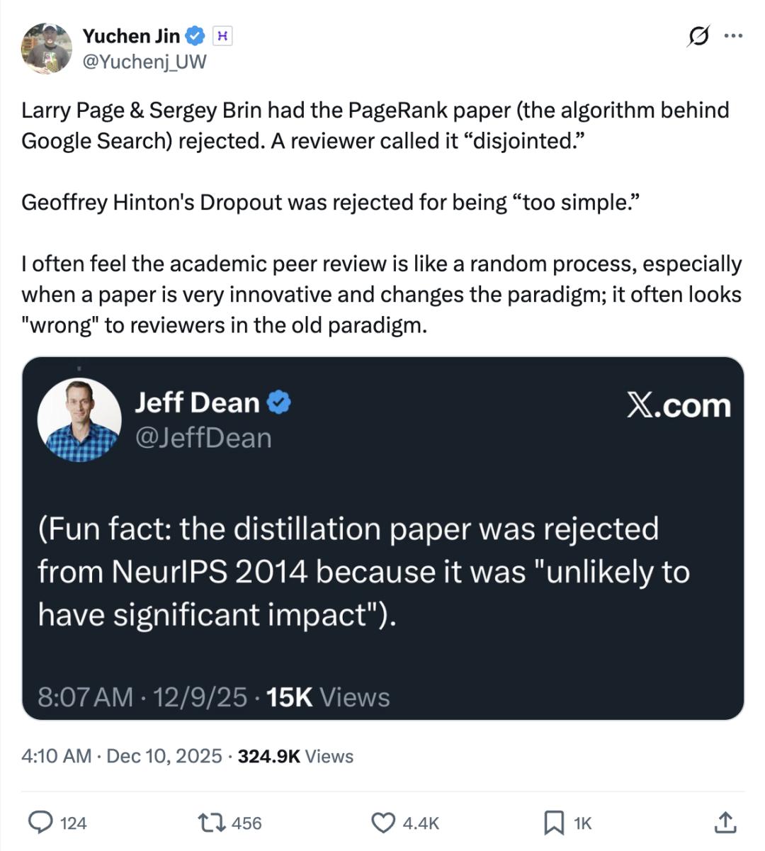 去年NeurIPS投稿暴涨至21575篇时,Jeff Dean就曾回忆起早年“蒸馏论文”被拒的往事——