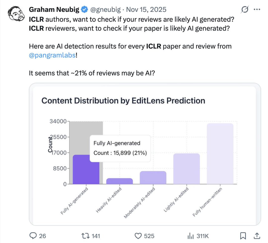 比如,即将在巴西举办的ICLR 2026,去年出分时就被曝出有21%的评审意见是AI写的。