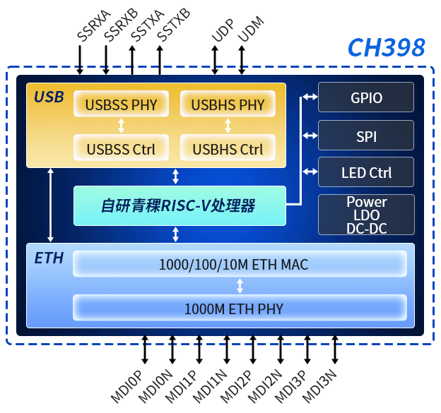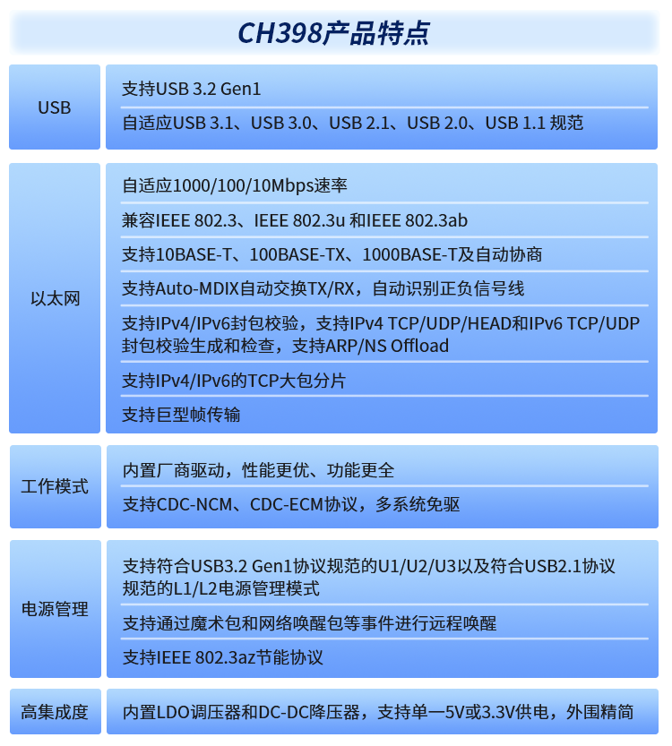 芯片内置5Gbps超高速USB3.0 PHY及USB2.0 PHY,支持USB3.2 Gen1,自动适应USB3.1、USB3.0、USB2.1、USB2.0规范,支持LPM电源管理及U1/U2/U3低功耗状态。通过内置超高速USB控制器提供设备功能访问接口,可高效实现USB3.0协议规定的各种数据传输与上层协议。凭借多以太网速率和多USB接口规范的广泛支持,CH398成为各类服务器、计算机、笔记本和工业设备扩展以太网口的理想选择。