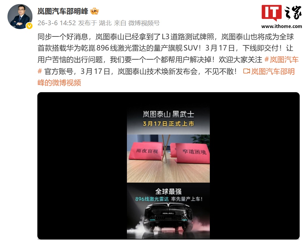 IT之家注意到,岚图汽车科技股份有限公司董事长卢放此前宣布,3 月,中国首款量产 L3 级 SUV —— 岚图泰山黑武士将正式上市。新车将率先搭载华为最顶级的乾崑智驾 ADS 四激光方案,基于对环境的精准感知,可向周围传递信号、沟通意图,实现感知与预判能力的全面跃迁。