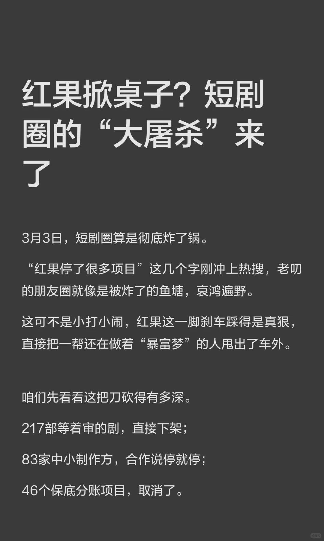 “人事方面,红果进行了大型的人事架构调整,大部分平台高管的岗位、职能都发生了变化;编剧方面,年前红果先后降低了合作编剧和工作室的保底金额,同时取消收本,暂停后台剧本上传;保底承制方面,过去两个月红果全面暂停了全国所有保底服务商的保底合作;承制选本方面,红果也在年前暂停了后台的选本功能。”