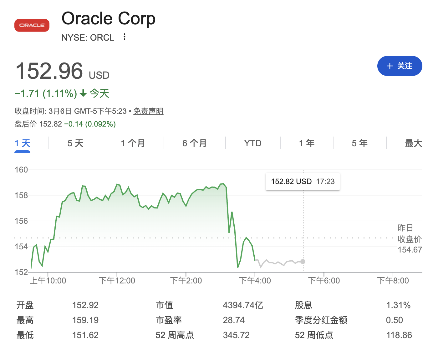 甲骨文股价周五在纽约收盘时回吐早前涨幅,收盘下跌1.11%,报152.96美元。与AI基础设施建设相关的其他公司普遍下跌,CoreWeave跌2.45%、AMD跌3.52%,英伟达跌2.98%。