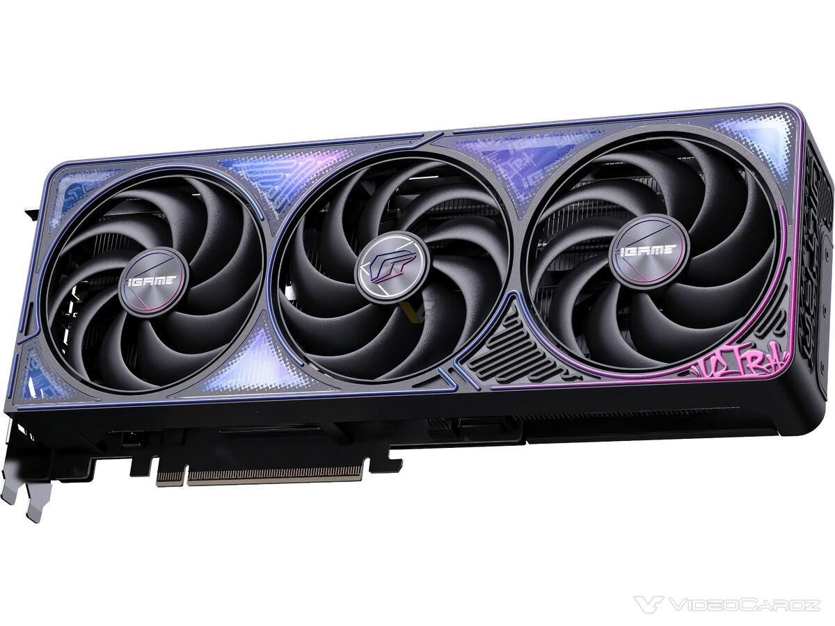 ▲ iGame GeForce RTX 5070 Ti Ultra W 16GB而根据外媒 VideoCardz 掌握到的情况,七彩虹还将推出一款名为 iGame GeForce RTX 5070 Ti Ultra Black 的显卡。其与现有 iGame GeForce RTX 5070 Ti Ultra W 产品采用类似的模具外观,但配色方案调整为黑底搭配紫色装饰。
