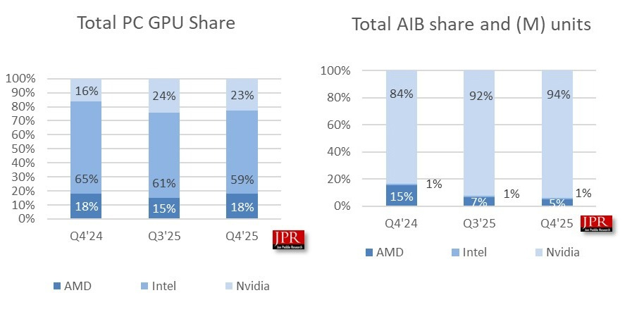 JPR 数据:AMD 整体 PC GPU 市占在 2025Q4 走高,但独显占比下滑