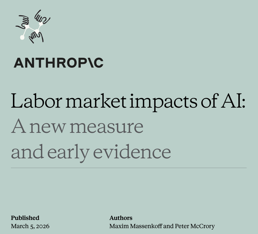 3 月 5 日,人工智能公司 Anthropic 发布了一份题为《AI 对劳动力市场的影响:一种新衡量标准与早期证据》(Labor market impacts of AI: A new measure and early evidence)的研究报告。该报告由经济学家 Maxim Massenkoff 和 Peter McCrory 撰写,基于 Claude 的实际使用数据对这一问题进行了分析。报告的结论是:目前大多数已有工作经验的从业者岗位还相对稳定,但刚进入就业市场的年轻求职者面临更大的挑战。