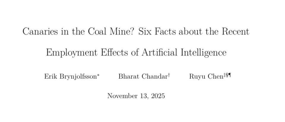 这一发现与学术界其他研究结果一致。2025 年,斯坦福大学数字经济实验室主任 Erik Brynjolfsson 及其团队发表论文《煤矿里的金丝雀?关于人工智能近期就业影响的六个事实》(Canaries in the Coal Mine? Six Facts about the Recent Employment Effects of Artificial Intelligence),基于美国自动数据处理公司(ADP)的高频薪酬数据,分析了数百万工人的就业情况。