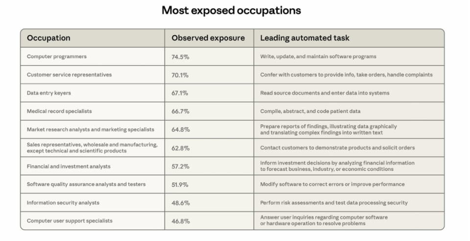 图 | AI 暴露度最高的十大职业(来源:Anthropic)