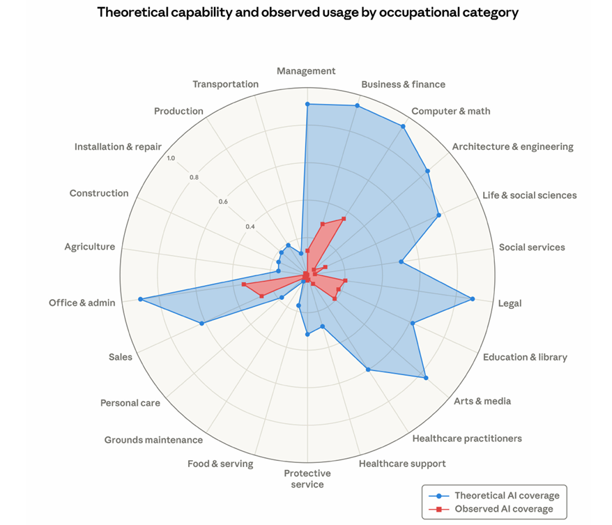 图 | 不同职业类别的理论能力与实际暴露度对比(来源:Anthropic)