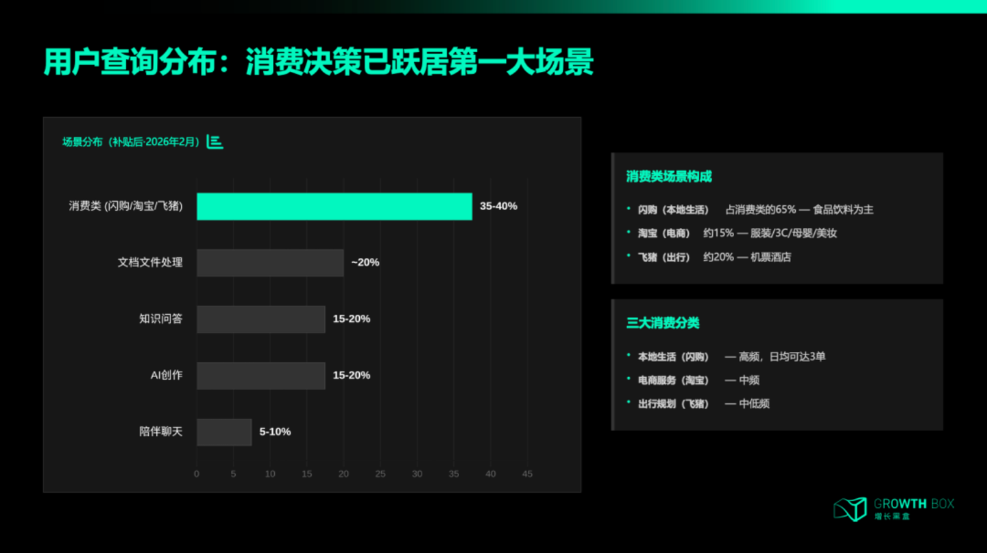 增长黑盒的调研显示,1月26日千问全面开放消费功能之前,消费决策相关提问占比不到20%,排在知识问答和AI创作之后。开放当天,消费类占比直接跳升到30%以上,并在随后两周稳定在35%到40%之间,成为千问的第一大使用场景。
