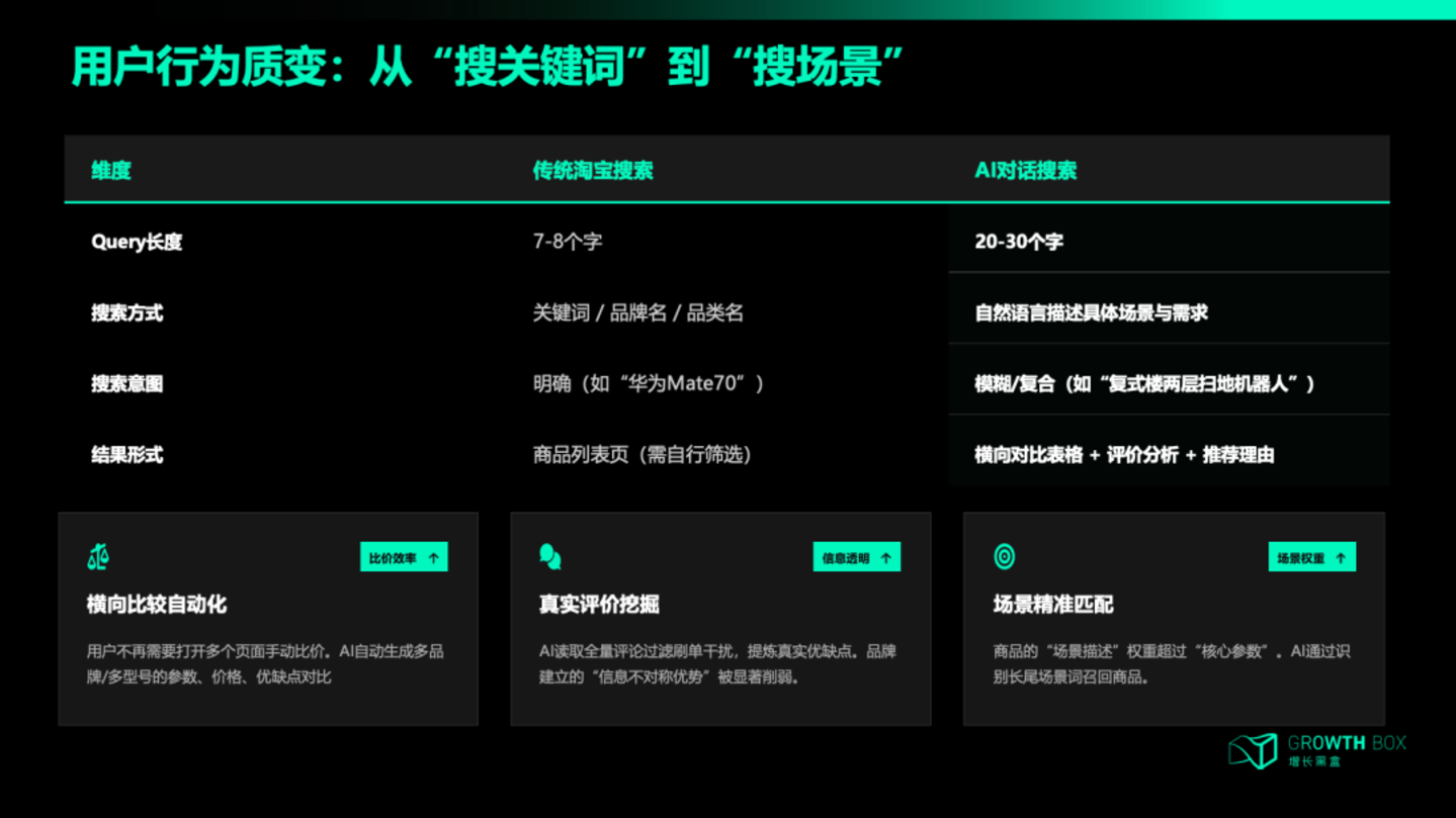 千问的平均query长度是20到30个字,对于场景的上下文理解大于单一的品类或品牌。AI需要从场景中理解需求,再把需求翻译成具体的商品推荐。