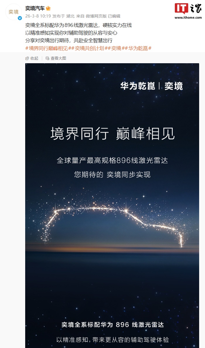 IT之家 3 月 8 日消息,由华为乾崑与东风联手打造的奕境汽车今日官宣,奕境将全系标配华为 896 线激光雷达(官方此前曾表示新车会搭载该款激光雷达,但并未说明是全系标配)。