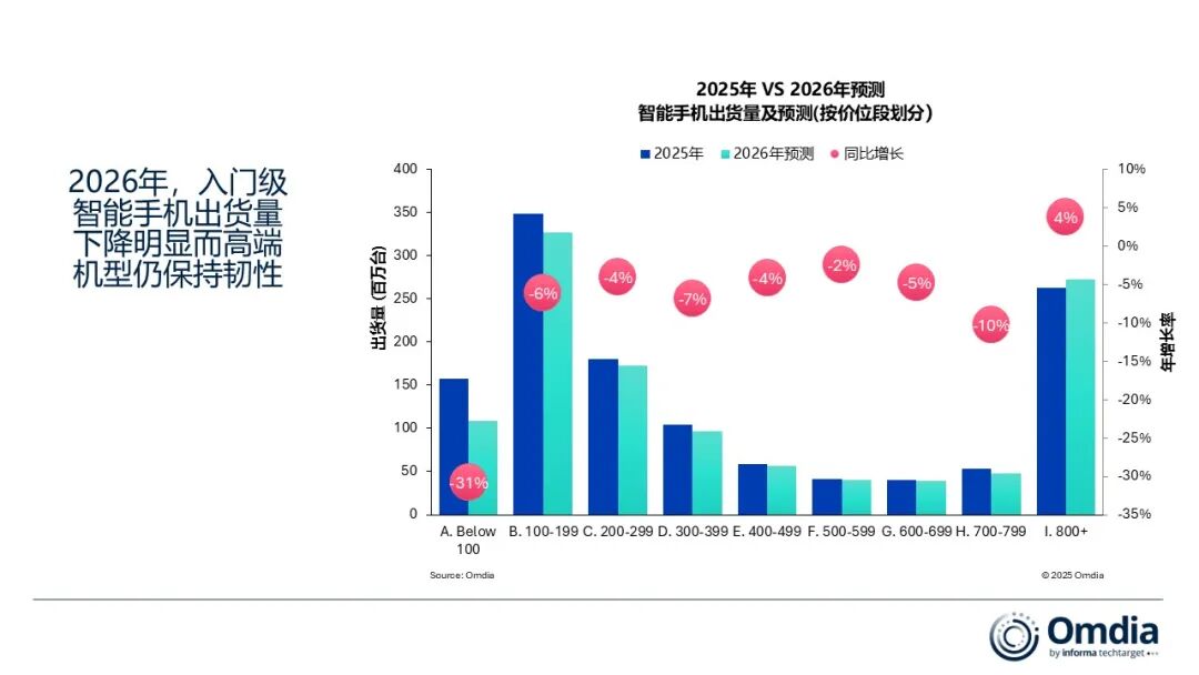 Omdia指出,如果存储器价格在AI 服务器需求持续锁定产能的推动下继续保持明显上涨至2026年下半年,全球智能手机市场将面临更大的下行风险。在这种情况下,智能手机厂商在入门级和高端机型上的成本都将进一步上升。与此同时,中东地区地缘政治紧张局势的升级可能加剧宏观经济波动,包括能源价格上涨、运输成本增加以及汇率不稳定,从而进一步削弱价格敏感市场的消费者换机需求。在这一不利情景下,2026年全球智能手机出货量可能下降超过15%,届时将超过2022年录得的同比12%的跌幅。