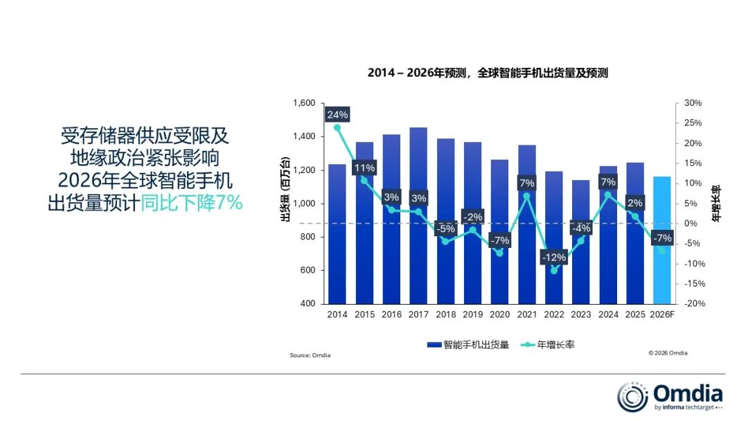 Omdia最新预测,2026年全球智能手机出货量预计将同比下降约7%。该预测基于2026年第一季度的存储器价格假设,预计随着时间推移,价格压力和供应紧张将在今年下半年开始有所缓解。2026年,全球智能手机市场将面临显著挑战。存储器供应趋紧以及价格持续高位,使厂商成本压力不断上升。
