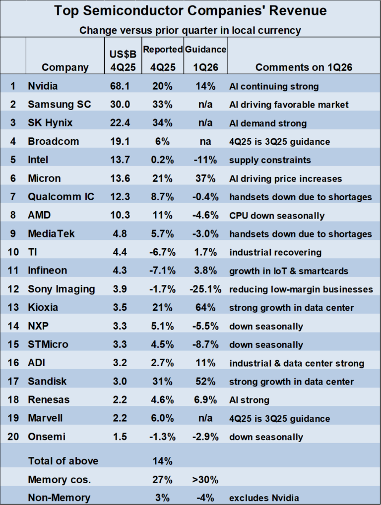 2025年第四季度业绩喜忧参半。存储器公司营收较2025年第三季度增长21%至34%。英伟达营收增长20%。十家公司2025年第四季度营收增长0.2%至11%。四家公司(德州仪器、英飞凌、索尼影像和安森美)营收下滑。