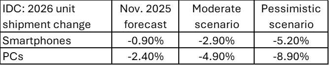 去年12月,IDC指出,内存短缺可能会导致2026年智能手机和PC的出货量下降。