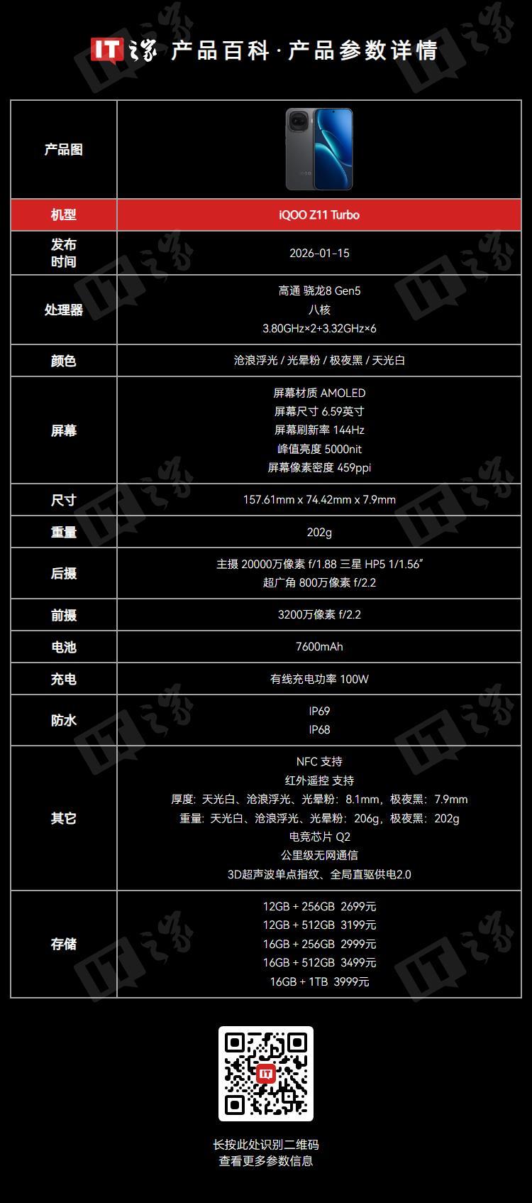 作为比较,iQOO Z11 Turbo 手机已于 1 月 15 日发布,搭载第五代骁龙 8 处理器、2 亿主摄、6.59 英寸 2750×1260 OLED 面板、搭载 7600mAh 电池,售价 2699 元起。