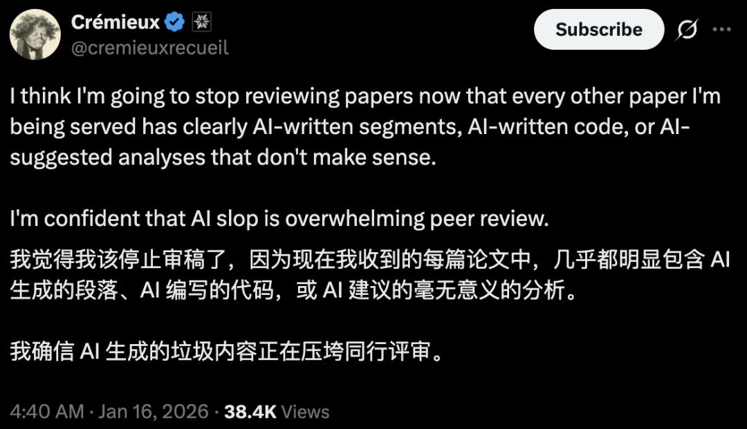 它会让原本就超负荷的审稿人工作量暴增,导致那些真正优质的、凝结人类心血与智慧的研究被淹没在AI生成的垃圾论文中。
