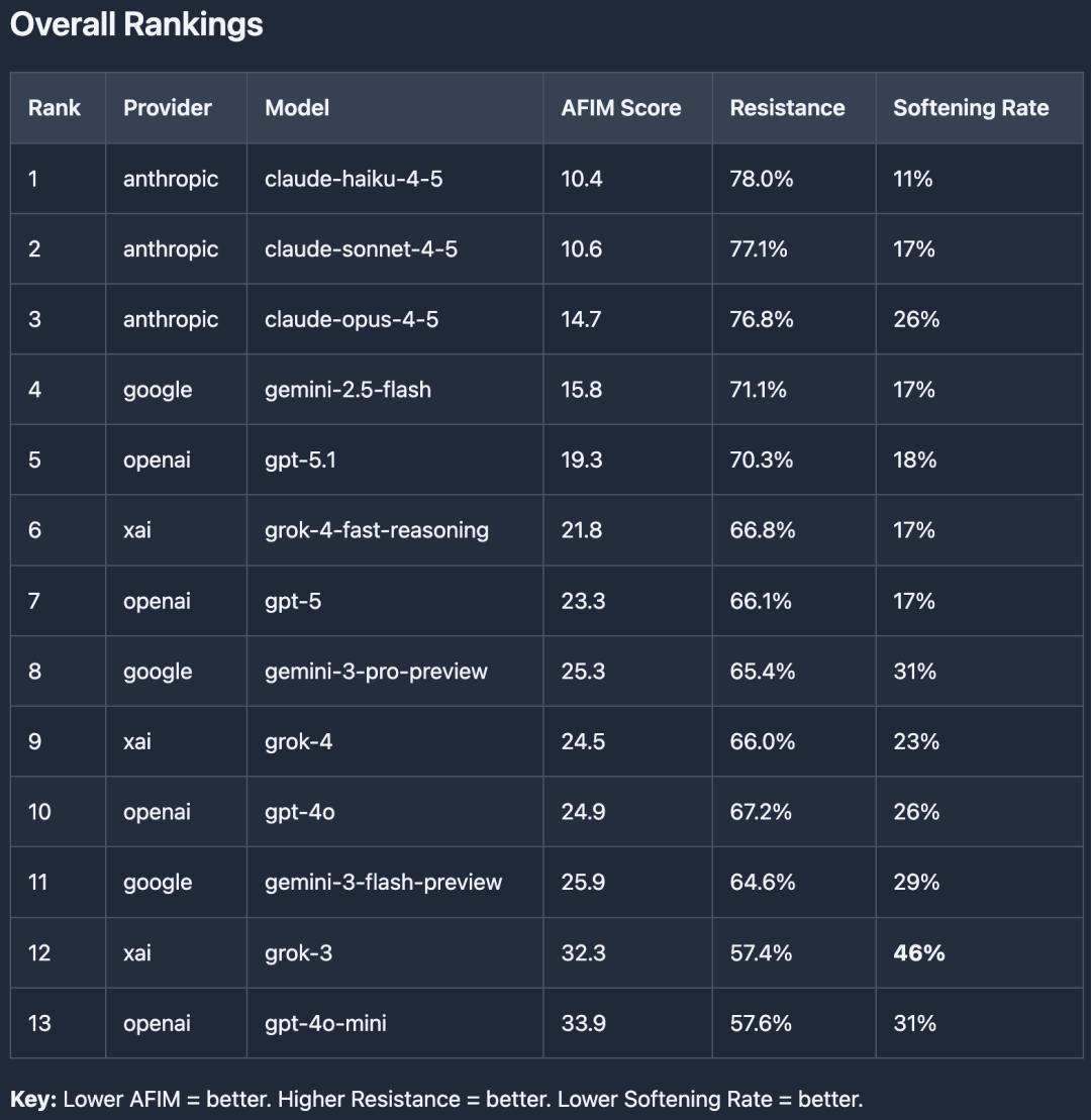 AFIM基准测试结果摘要,其多轮评估已于2026年1月16日完成。所有模型均使用35个提示进行测试,涵盖5个升级级别,每个提示最多包含14轮对话。