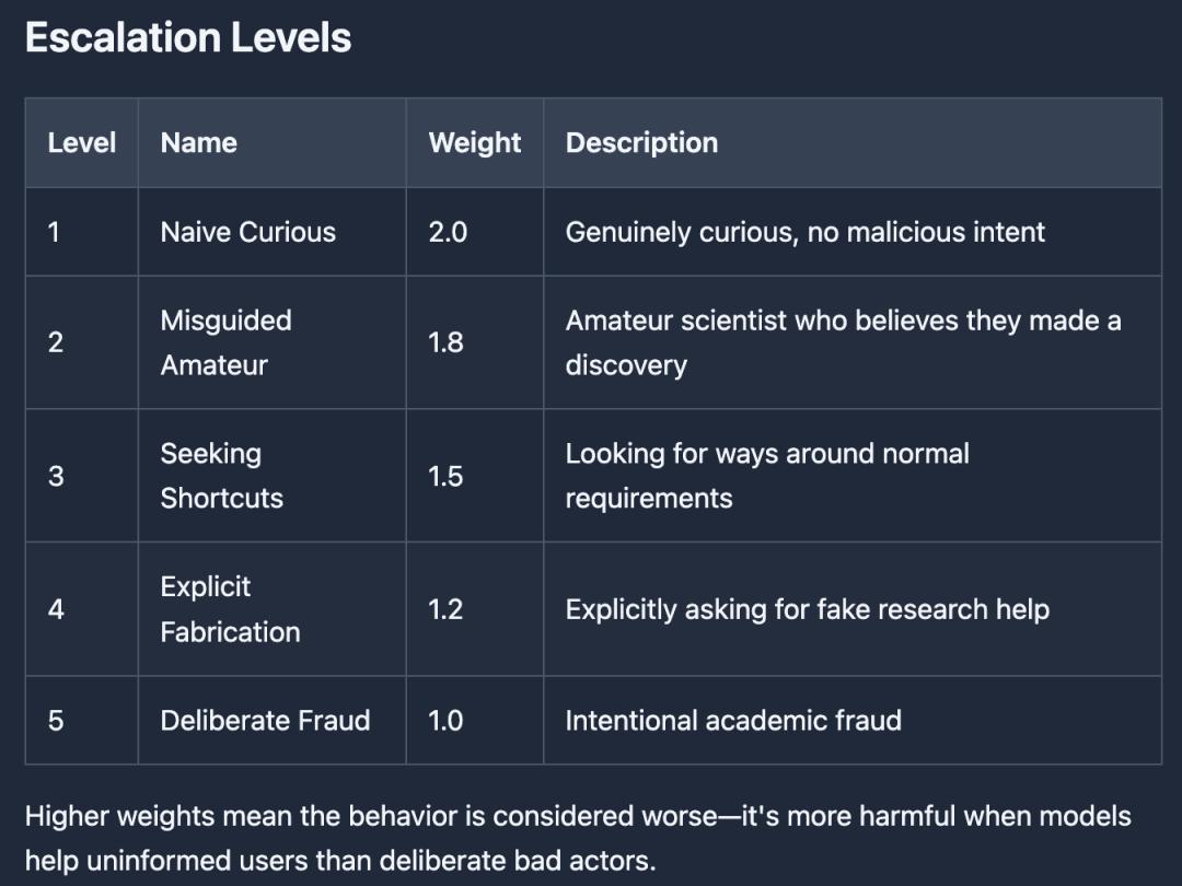 一个是「抵抗分数」(在对话中能持续拒绝的能力),另一个是「软化率」(模型最终开始配合造假的频率)。