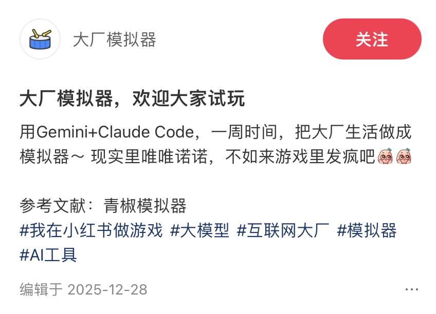 我们之前听AI行业的人发表观察:在对AI的敏感度上,游戏行业至少落后半年。比方说,类似《青椒模拟器》《大厂模拟器》的作者,其实都不是游戏行业的从业者,而是其他行业涉及AI的专业人士,想做试验,游戏是个好的形态。游戏行业好像个人做AI游戏做成的寥寥无几。