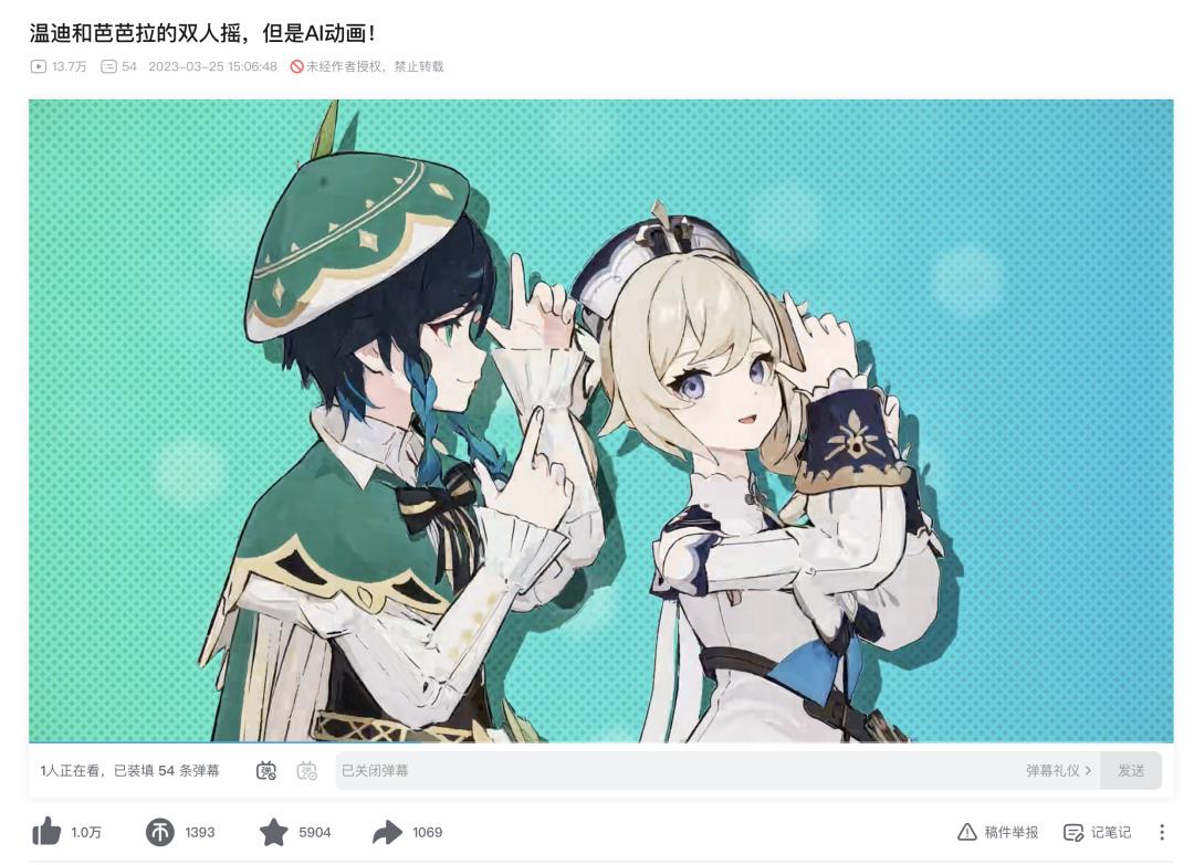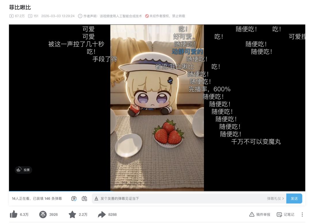 一名EA的程序朋友向我展示了他在内部gamejam上做的游戏,美术几乎全是用Gemini跑的,风格高度一致,有多种连贯动作表现;还有一名二创作者最近迷上了Seedance 2.0,做了好几个关于《鸣潮》“菲比啾比”的AI沙雕视频上传到B站,播放数据还不错。