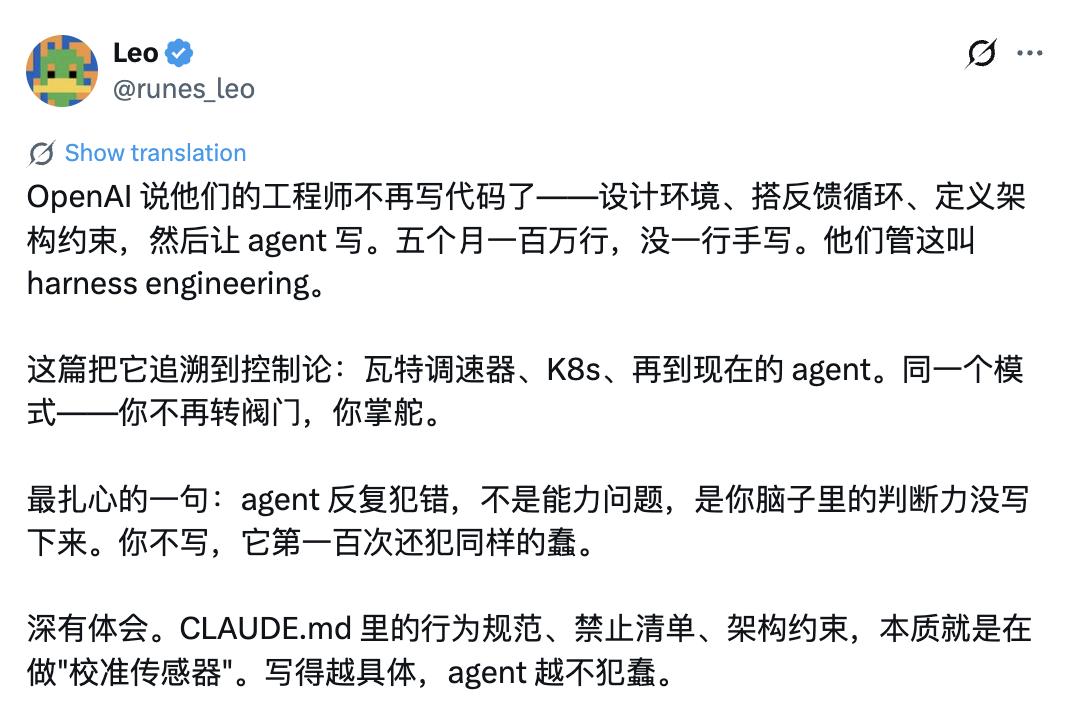 这篇 Blog 在技术圈引起了的广泛关注和讨论,有人认为,这个 Harness Engineering 本质上是一种现代版的控制论:工程师不再直接写代码,而是设计系统、规则和反馈回路,让 agent 自动完成工作。