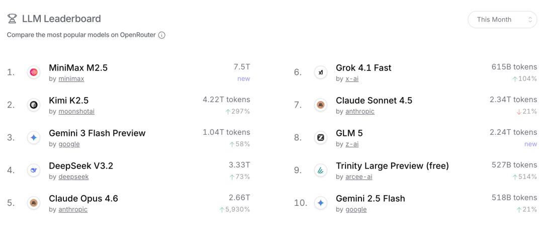 来自 全球最大AI模型API聚合平台OpenRouter的数据显示,截至2026年2月28日,前十模型总Token消耗量已突破28.7万亿,其中中国模型贡献超过14.69万亿,单月Token调用占比首次过半。