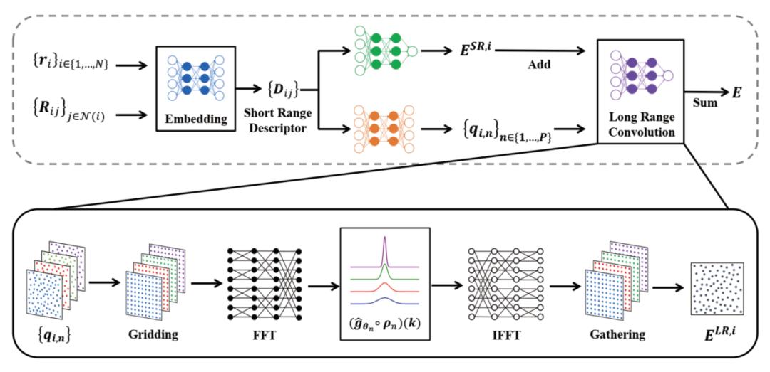 索格智算致力于用算法突破解决新材料研发周期长、成本高的行业痛点。其核心技术之一在于其提出的新型神经网络描述子——SOG-Net。该算法通过将总势能分解为短程与长程项独立建模并高效耦合,引入可训练的高斯和函数,自适应拟合库仑、色散等长程作用,显著降低了复杂系统能量与力的预测误差。