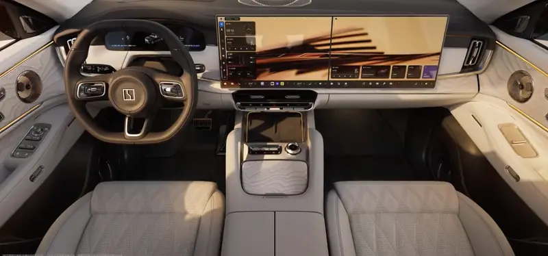 内饰方面,新车采用中控 + 副驾双联屏设计,配有前排双杯架、手机无线充电、吸顶屏等设施,并同样配备“宾利同款”Naim 音响。值得一提的是,新车在仪表台、车门板上配有多个实体按键,预计可以控制座椅加热 / 通风 / 按摩 / 躺倒等多个项目。