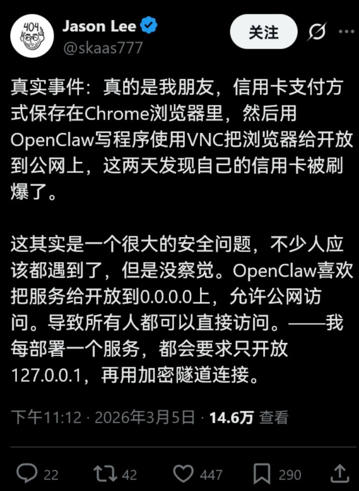 在第一批“养虾”的人中,就有人在Chrome浏览器里保留自己的信用卡支付方式,再用OpenClaw写程序使用VNC把浏览器给开放到公网上。