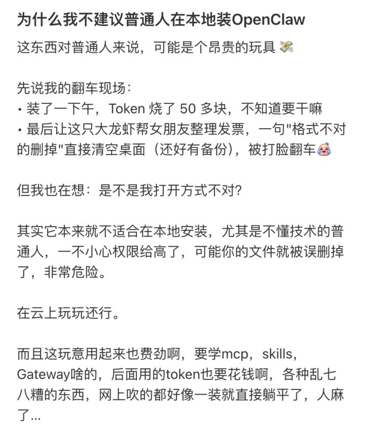 继第一批安装且用上龙虾的用户过后,花token烧了不少钱还没办成什么事,是新手中最常见的现象。