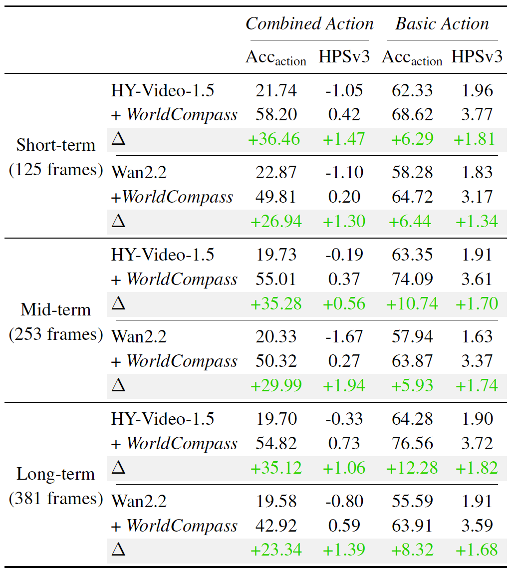 团队在最新的开源 SOTA 模型 WorldPlay 上进行了验证。结果显示,经过 WorldCompass 的后训练,模型能力实现了大幅提升。
