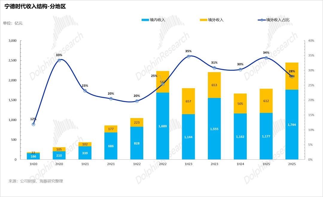 2025年下半年,宁王的境外收入占比环比下滑6个百分点至28%,海豚君认为可能由于海外的储能确收因为时间差因素占比下滑,以及国内的动力电池占比上行所致,而销量结构中低价LFP的占比预计也在上行;