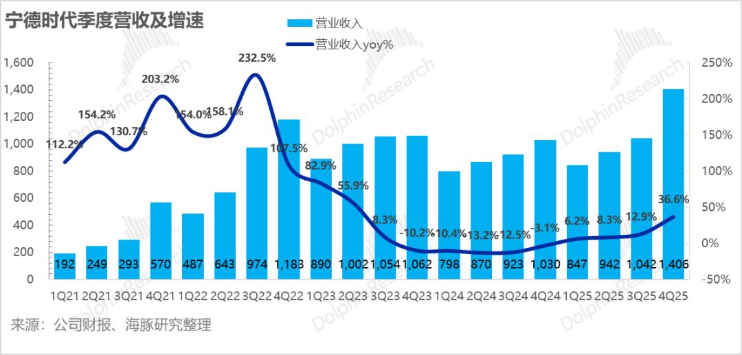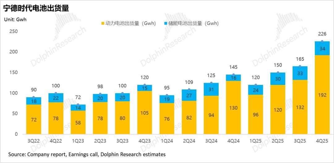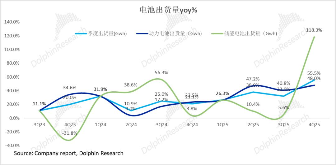 2025年四季度单季收入1406亿,同比增速已经达到37%,也充分验证了锂电的上行周期的启动,同样也大幅高于市场预期的仅1253亿,而超预期的核心仍然在于出货量继续高增,但单价端仍然保持稳定。