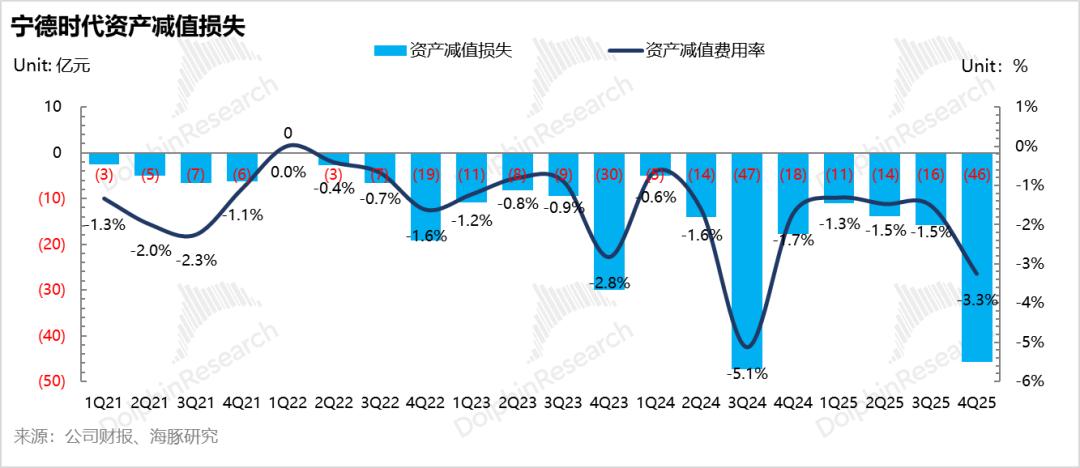 ②长期资产减值:矿产资源相关的资产,2025年下半年环比上行18亿至22意愿。2025年8月,宁德时代旗下枧下窝锂矿因采矿证续期问题停产,尽管碳酸锂价格在四季度上涨,但矿山复产时间)和最终审批仍存不确定性,也因此海豚君预计公司四季度在该方面计提了减值,且市场已经有充分预期,所以影响也不大。