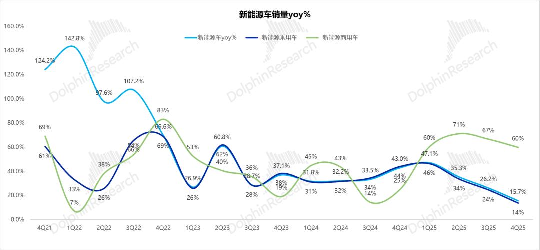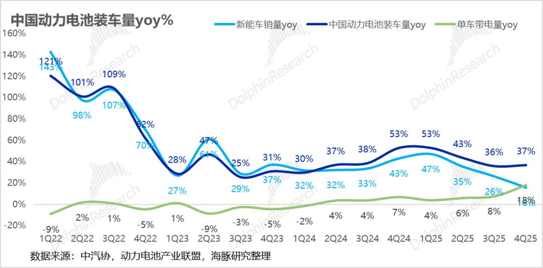 自2024年Q2起,中国动力电池总装机量增速便持续领跑新能源汽车销量增速。这一趋势在2025年Q4演绎得尤为极致:受地方国补退坡及2026年购置税政策预期影响,Q4整体新能源车销量增速放缓至约16%。