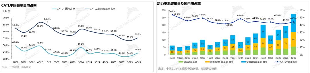 2025年Q4,宁德时代在国内市场的市占率已开始环比回升(剔除比亚迪后的市占率高达56%),前期动力电池因产能瓶颈导致的份额流失问题(25年全年市占率微降1.7pct)已实质性解决,但储能电池交付量仍然受制于产能不足影响。