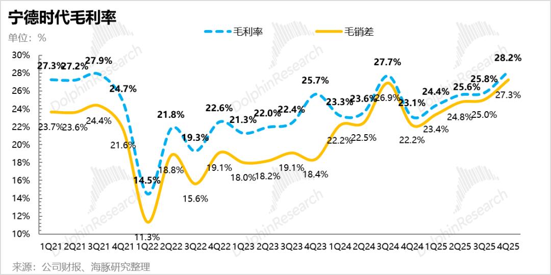而从宁王毛利率水平来看,2025年四季度整体毛利率继续环比高增,环比上季度25.8%提升2.4个百分点至28.2%,即使从毛销差角度来看(毛利率-销售费用率)同样环比提升2.3个百分点至27.3%!也直接带动宁王单wh毛利从上季度的0.16元/wh环比提升至四季度0.18元/wh。