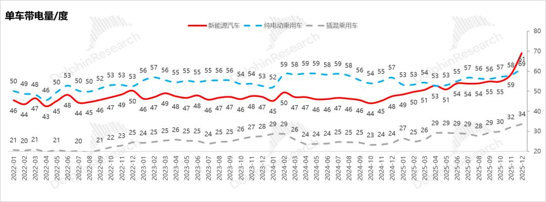 在纯电与插混车型结构相对稳定的背景下,乘用车电池单车容量仍然在不断上行,海豚君预计2026年平均单车带电量将保持约4%的增长,主要由于: