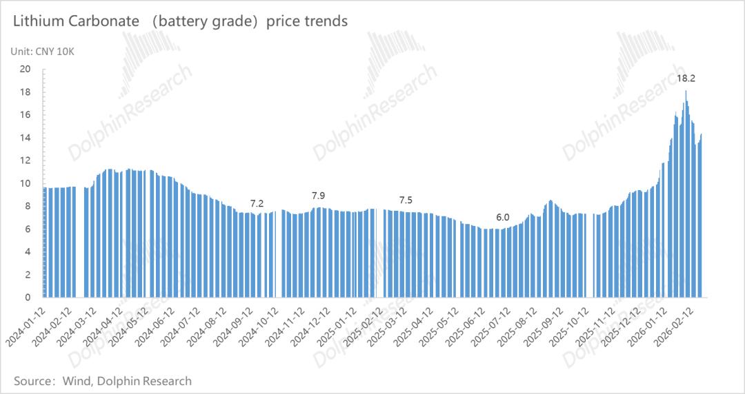 2025年Q3以来,碳酸锂、铜、电解液等核心原材料价格加速上涨,其中碳酸锂的价格2025年四季度7-8元/吨快速上涨至四季度的9-10元/吨,并在一季度加速上涨至最高点约18元/吨。