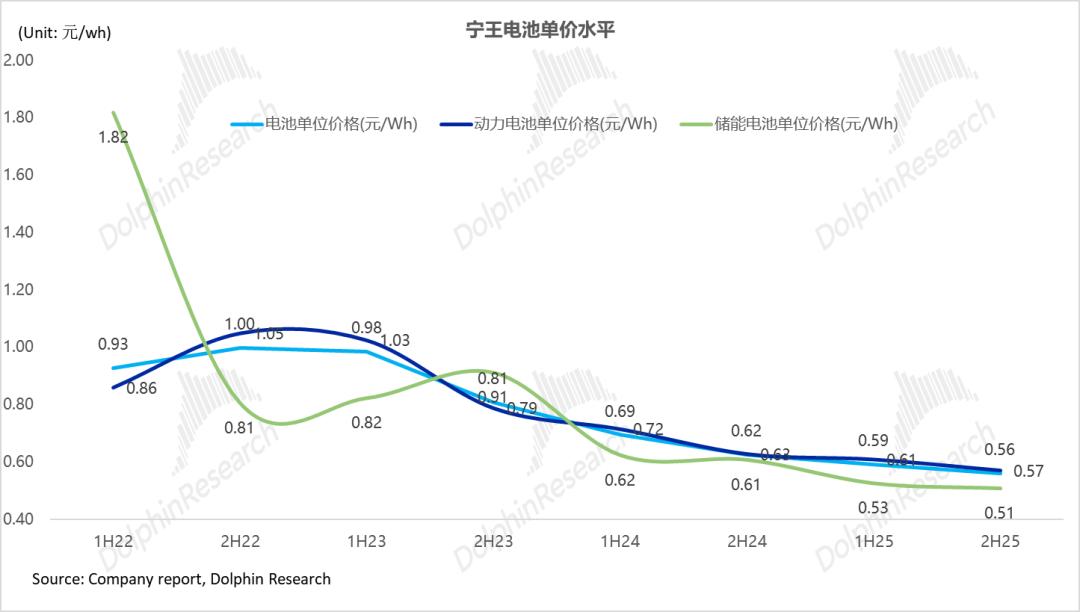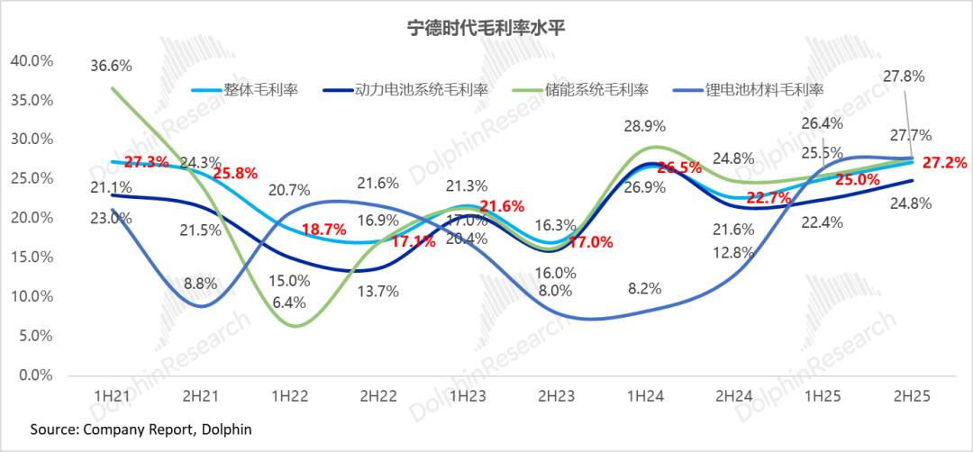 从2025年下半年来看,动力电池毛利率达到24.8%,环比上行2.4个百分点,而储能电池毛利率同样也在环比上行,四季度储能系统毛利率27.7%,环比上行2.2个百分点,海豚君认为,在电池单价环比持平,以及行业面碳酸锂成本还在上行情况下,宁王的单wh毛利和毛利率还都在环比上行,主要由于: