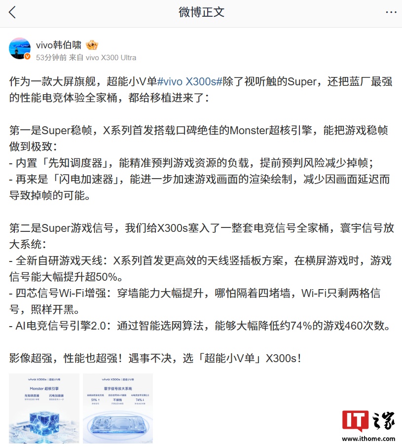 IT之家 3 月 10 日消息,vivo 通信科技有限公司产品经理韩伯啸今日继续预热 X300s 新机。据称,vivo X300s 将“移植”蓝厂最强性能电竞体验全家桶,含 Monster 超核引擎、寰宇信号放大系统等。