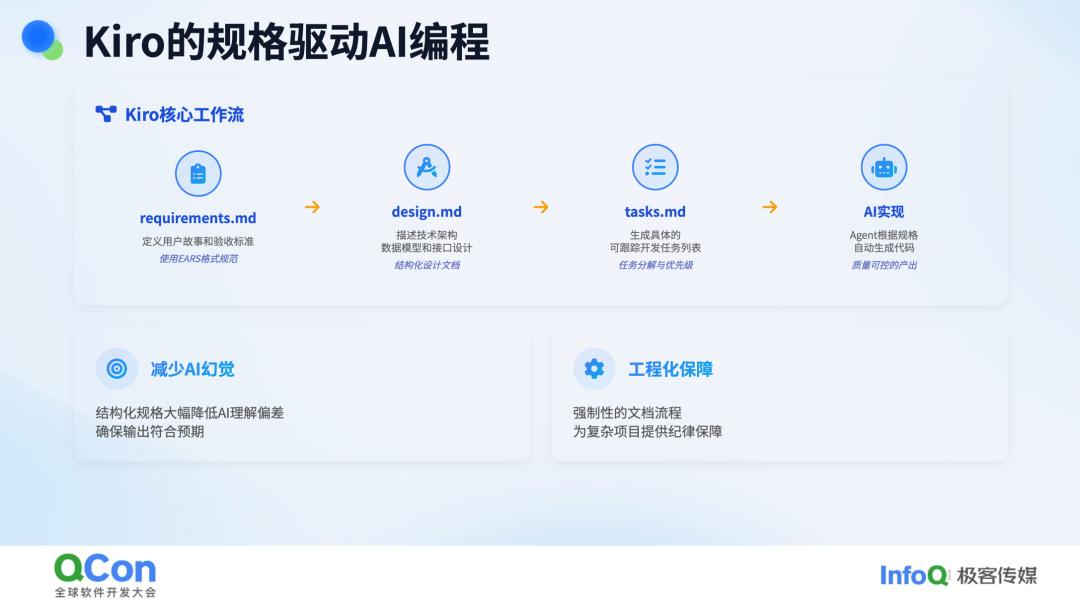 在编程领域,我们并非总是采用“一竿子捅到底”的方式。事实上,软件工程的思想一直存在,而这些思想同样适用于 AI 编程。Kiro 提出了一个概念,即 Spec-Driven 的 AI 编程。这实际上是在 AI 编程领域的一种标准化或流程化方式。其过程通过几份标准文档来驱动整个任务的推进。首先,通过需求文档与用户梳理需求,然后根据需求文档编写设计文档,设计文档再驱动任务的拆分,最终由 AI Agent 根据这些任务逐步实现具体需求,从而完成整个项目。这并不是一气呵成的方式,而是一个有规划、有步骤推进任务的过程。