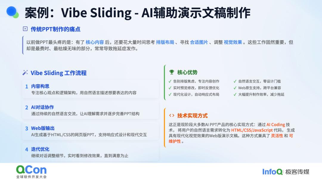 比如制作幻灯片 Vibe Sliding。从今年开始,我再也不为准备 PPT 而焦虑了。过去,我总是拖延到最后一两天才开始制作幻灯片,因为虽然演讲的内容我早已了然于心,但排版、绘制图形、寻找图片并进行排版这些繁琐的工作让我感到头疼。我这份 PPT 完全是通过 AI 生成的,从风格上应该能看出来,理论上人工制作的 PPT 不会使用这么多颜色,但它的可读性依然不错,能够清晰地传达信息。整个 PPT 的制作过程就像编程一样,通过 AI 完成,包括插入的 logo 等元素也都是通过 AI 添加的。而且由于 PPT 本质上是一个网页,AI 在编写网页方面也早已驾轻就熟。现在,我再也无法回到手工制作 PPT 的时代了,基本上都是通过 AI 来完成这项工作。