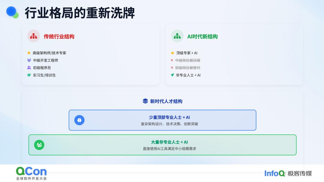 这种变化意味着中间部分的人才将面临分流。一部分人可能会努力提升自己,进入顶端的专业领域;而大部分人可能会下沉,与普通“小白”处于同一水平。这实际上是对行业格局的一次重新洗牌。在数字化行业尤其如此,未来人和组织都将朝着 AI Native 的方向发展,即人们会习惯于在工作中依赖 AI,这样才能适应未来的趋势。如果仍然单靠个人力量,不借助 AI,很快就会被时代抛弃。组织也是如此,传统的组织架构将逐渐转变为扁平化且 AI Native 的模式。未来,这将是一个超级个体崛起的时代。