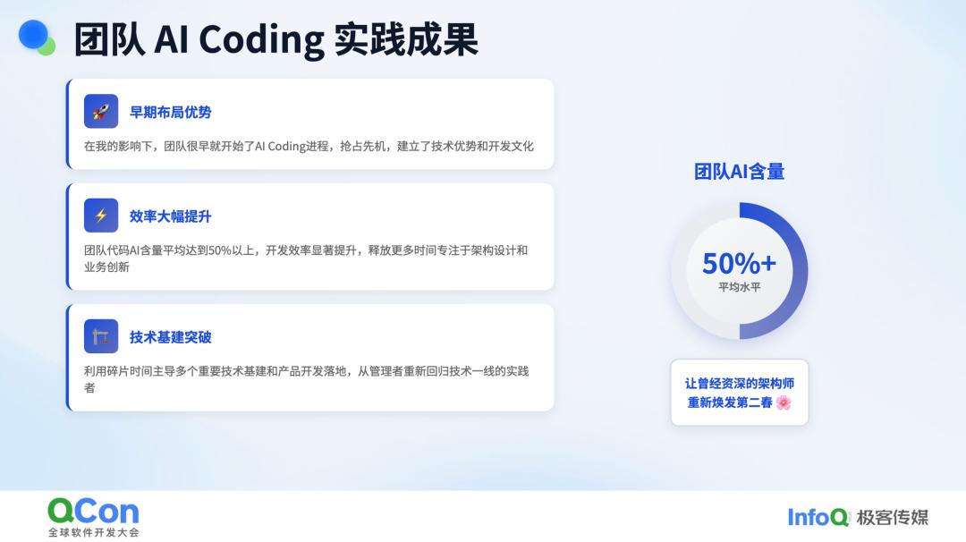 在我的带动下,我的团队也积极投身于 AI Coding。目前,团队中大约 50% 的代码由 AI 编写。之所以没有达到 100%,原因有两方面。一方面,对于一些前端项目,AI 还原度并不高。因为视觉模型与文本模型之间存在天然的差距,目前尚未得到很好的解决,视觉还原能力这一块还存在不足,所以这部分工作仍需人工参与。另一方面,有些团队成员不想让 AI 完全包办所有工作,他们希望保留一定的掌控感。他们会编写大致的框架,然后让 AI 填充细节。这样一来,如果出现问题或故障,他们可以迅速自行修复,而无需再次求助于 AI。这种主动降低 AI 含量的做法,导致团队中并非所有人都能达到 100% 的 AI 含量。