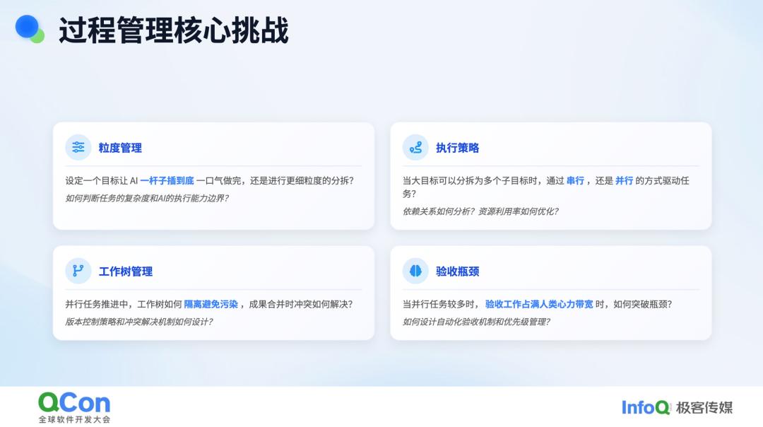 接下来是过程管理。当我们让 AI 执行任务时,可以选择让它一竿子插到底,从下午 2 点开始工作,到 5 点回来验收成果。这是一种方式。但另一种方式是将任务拆分成多个子目标,这涉及到所谓的粒度管理。当我们需要将任务拆分时,还需要考虑是通过串行还是并行的方式来实现。并行处理是常见的选择,比如同时打开多个窗口让 AI 完成不同任务。然而,在并行处理时,我们可能会遇到工作目录污染的问题,尤其是在编写代码时,如何避免多个 feature 之间的相互干扰是一个挑战。当所有 AI 任务完成后,我们如何验收结果?人类是否能够在短时间内切换多个上下文?这反过来挑战了人类的上下文管理能力。这些就是过程管理中的一些核心挑战。