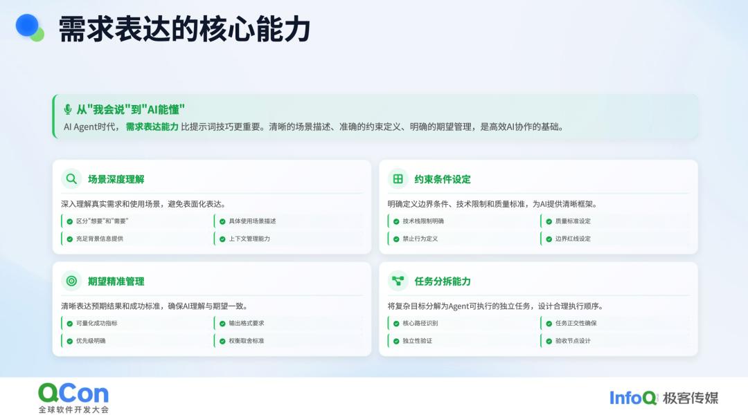 需求表达能力成为与 AI 协同工作的核心能力。为了让 AI 理解并执行任务,我们需要非常精确地描述需求。这其实比管理人还要复杂,因为 AI 没有情绪,但它需要清晰的指令。现在,为了让 AI 完成任务,我需要详细地写出任务细节、想法和思路。如果 AI 不理解,我还需要继续补充。有时,我输入的内容可能多达几百字,这是前所未有的。所以,管理 AI 并不比管理人轻松,你需要全方位地表达清楚,对业务场景有深刻的理解,知道领域的专业知识,并且对期望的成果有准确的预期。你不能不确定结果就随意给出需求,否则 AI 给出的结果多半不符合你的期望。此外,你还需要设定约束条件,甚至需要对任务进行拆分,明确是让 AI 一竿子插到底完成任务,还是分步骤执行。这些都需要在需求表达中体现出来。