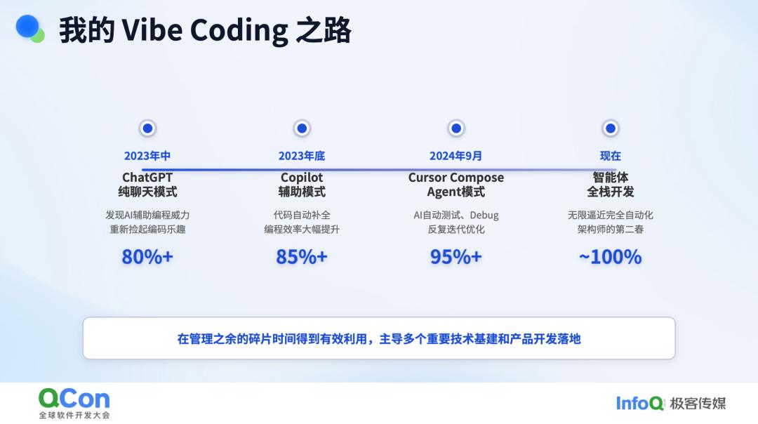 首先,我们来谈谈 Vibe Coding。对于从事技术工作,尤其是担任技术领导的人员来说,这是与 AI 直接相关且能显著提升工作效率的领域。使用 AI 来编写代码,如今已司空见惯,且在近一两年成为主流趋势。我稍后会举例说明,但可以说,我所编写的代码中,AI 的参与度几乎达到了 100%。
